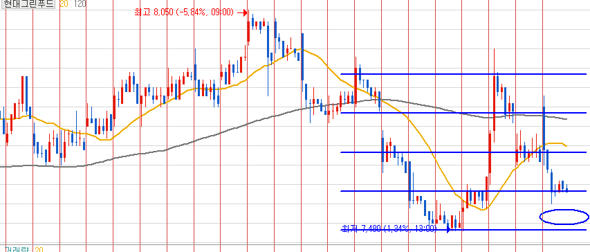 - 주가가 하락하여 1/4 위치에 도달하여 3~5거래일 이상 더 빠지지 않고 안착한 경우 진입.