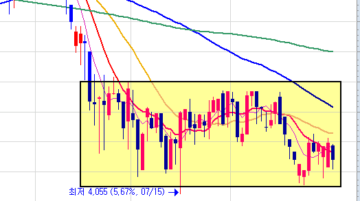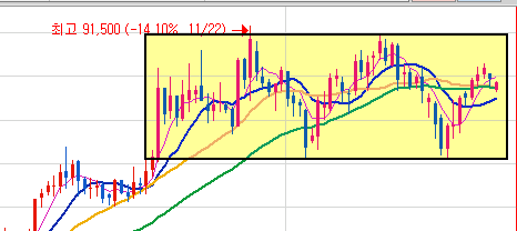 상세 정리에 앞서 돌파 전에 박스권에 익숙해지기 위해서 돌파를 하지 않은 채 박스를 그리고 있는 종목 몇가지를 살펴보겠다.