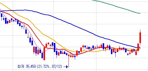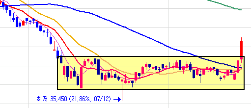 여기서는 박스권을 활용할 것이다. 차트를 보면 박스권을 그리 어렵지 않게 찾을 수 있다. 설명을 편하게 하기 위해서 오늘 박스권을 돌파한 종목을 하나 가져오겠다.