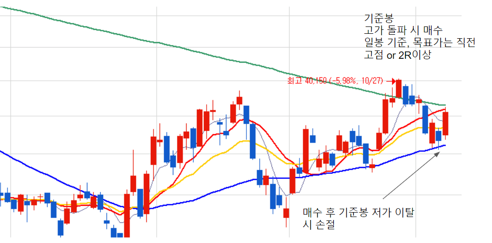2. 기준봉의 고가 돌파시 매수 매수 후 기준봉 저가 이탈 시 손절