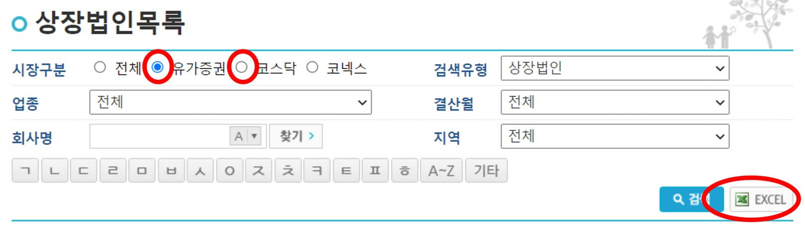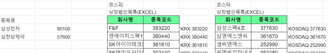 먼저 유가증권(코스피) 탭을 선택한 뒤 검색을 눌러 목록 최신화를 하여 엑셀 버튼을 눌러 데이터를 받아줍니다. 코스닥 데이터도 동일 과정을 반복해줍니다. 이후 다운 받은 엑셀 파일을 열어 종목명과 종목코드 부분을 구글 스프레드 시트에 붙여 넣어줍니다.