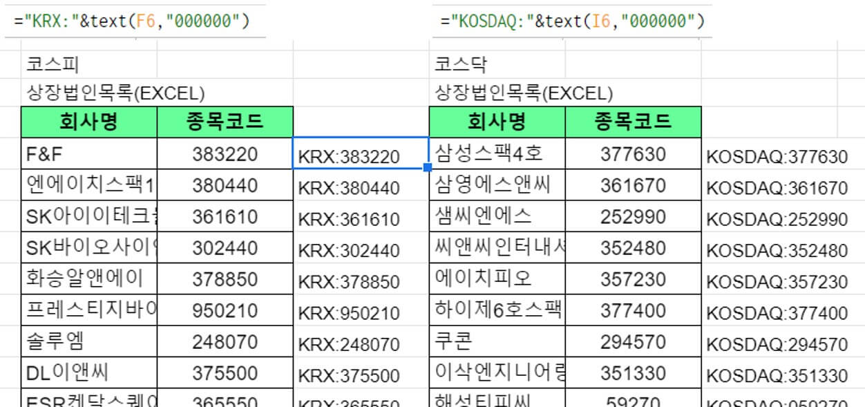 코스피와 코스닥 종목 코드 옆의 셀에 TEXT 함수를 사용해서 구글파이낸스 함수가 인식할 수 있도록 가공해줍니다.