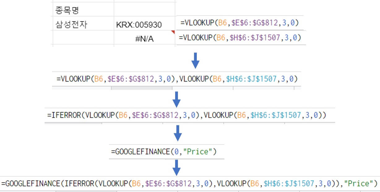 =GOOGLEFINANCE(IFERROR(VLOOKUP(B6, 코스피 데이터 범위, 3, 0), VLOOKUP(B6, 코스닥 데이터 범위, 3, 0)),"Price")