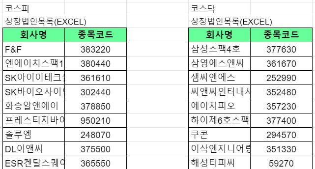 - 종목 코드 데이터를 일괄 다운로드하여 코스피 코스닥 데이터로 나눠서 배열
