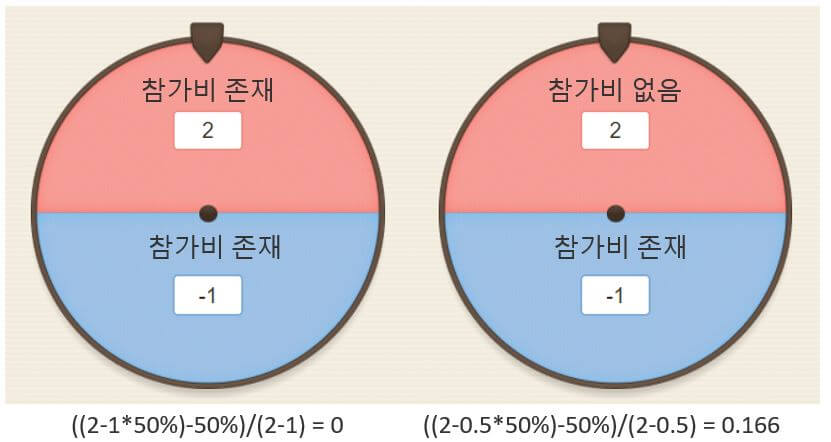 결과 값이 0으로 베팅을 해서는 안된다고 나옵니다. 하지만 한 가지 더 고려해야 합니다. 트레이딩에서는 포커나 경마와 같은 도박 혹은 로또와 달리 참가비가 절반입니다. 도박의 경우 승패와 관계없이 참가비(베팅액)를 징수하지만 트레이딩의 경우는 패배(손절) 시에만 비용이 청구되기 때문입니다. (수수료, 슬리피지는 고려하지 않았습니다.)