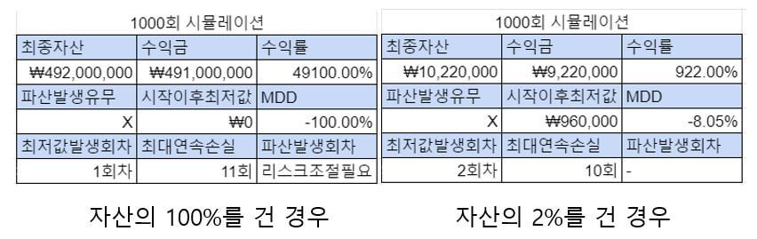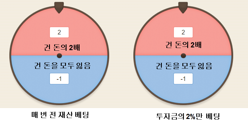 위 이미지의 게임의 회당 기대 값은 0.5입니다. 단 한 번만 하는 게임의 경우 왼쪽이 나을 수도 있습니다. 하지만 반복해서 게임을 하는 경우 왼쪽은 금세 파산할 것이고 오른쪽의 경우는 장기적으로 큰돈을 벌게 될 것입니다. 내 투자 자산의 2%를 걸고 계속해서 돌리면 돌릴 때마다 1%의 이익을 기대할 수 있다는 것이죠.