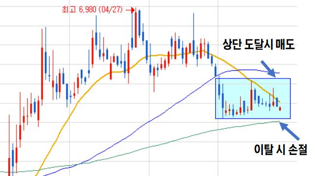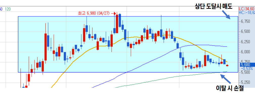 이렇게 좁은 범위로 설정을 할 수도 있습니다. 어느 것이 더 나은 방법인지에 대한 정답은 없습니다. 다만, 박스권을 크게 설정한 경우 상단에 도달하는데 몇개월의 시간이 소요되는 경우도 자주 목격할 수 있으니 그러한 기간을 견디지 못한다면 일정 기간내에 도달 하지 못하면 청산 하는 방법을 사용하거나 좀 더 좁은 구간을 사용 하는 것이 좋습니다.