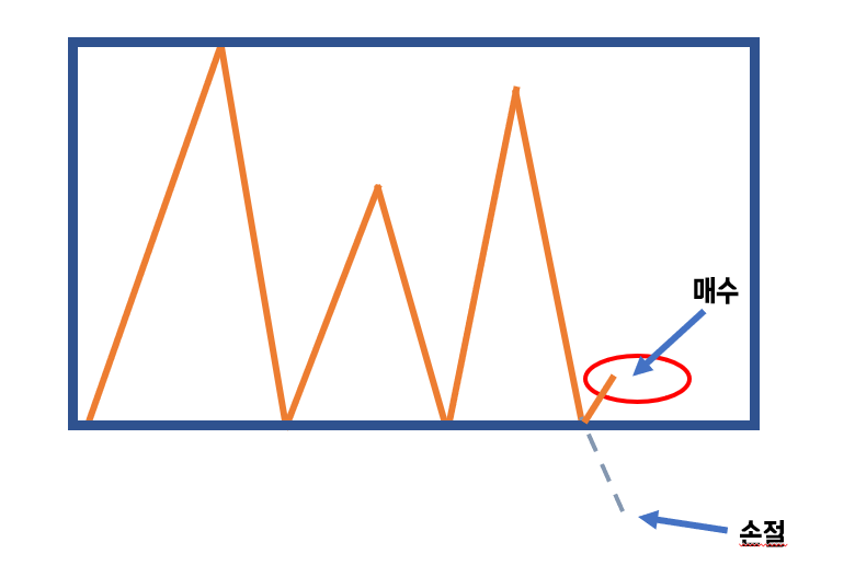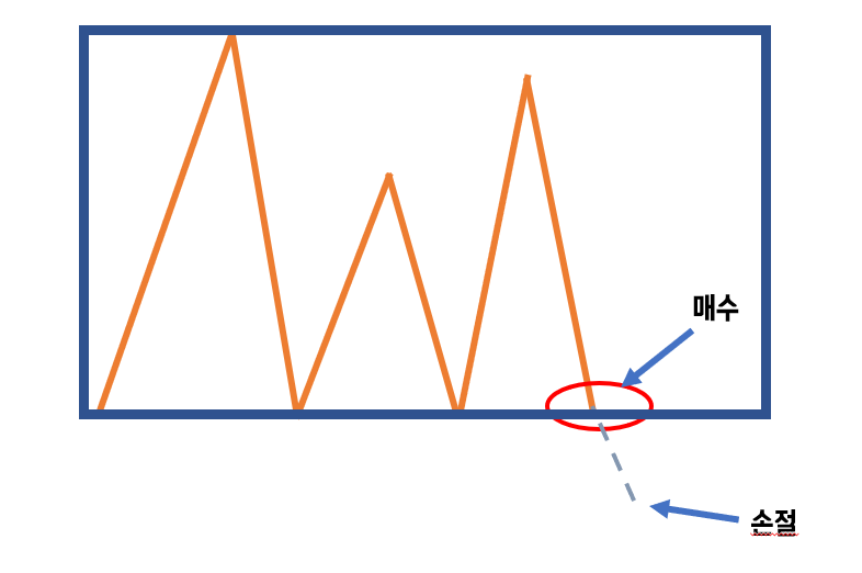 박스권의 하단에 도달할 경우 매수하는 방법입니다. 이전 지지 구간의 범위를 수평으로 연결하고 해당 구간에서 다시 반등할 것을 기대하고 매수를 하며 이탈시 손절로 대응합니다. 기본적인 이익 매도 구간은 이전에 많이 분포한 저항 구간을 매도 구간으로 정합니다.