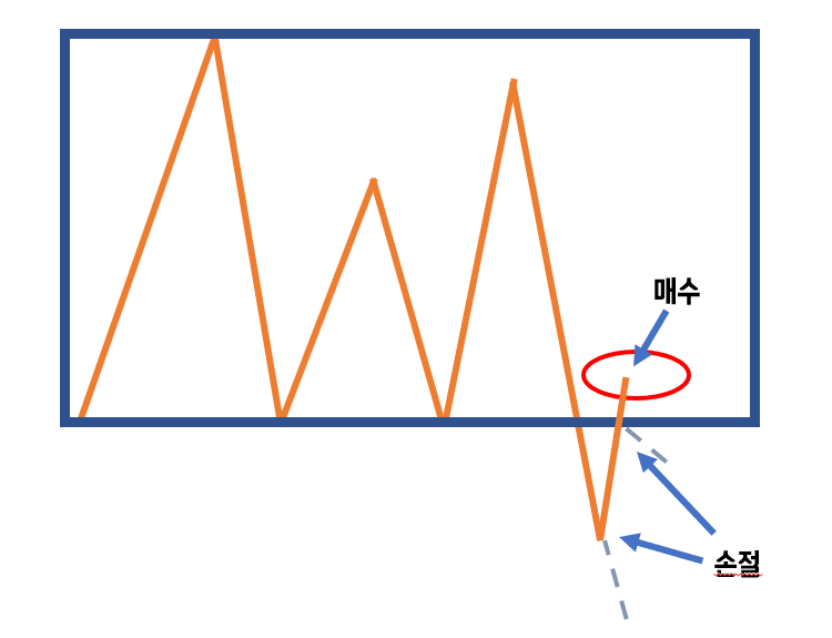때때로 박스권의 지지 영역은 시장의 급락 혹은 거짓 움직임 등에 의해 잠시 깨지기도 합니다. 하지만 이내 본래의 영역으로 복귀한다면 지지 구간이 튼튼하게 유지된 것으로 간주하고 진입을 할 수 있습니다. 손절 포인트는 이전 설정해둔 박스권의 하단이 재차 깨지는 경우 혹은 박스권의 하단이 잠시 깨지면서 생긴 V 골짜기의 저점을 기준으로 삼을 수 있습니다. 개인 심리상 편한 쪽을 사용하면 되겠습니다.